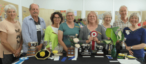 Joan Mury has been Trophy Coordinator since 1996. She says we had 15 trophies that year and gave either rosette ribbons or book awards for categories that lacked trophies. Today we have a total of 27 trophies but still, award some rosettes.